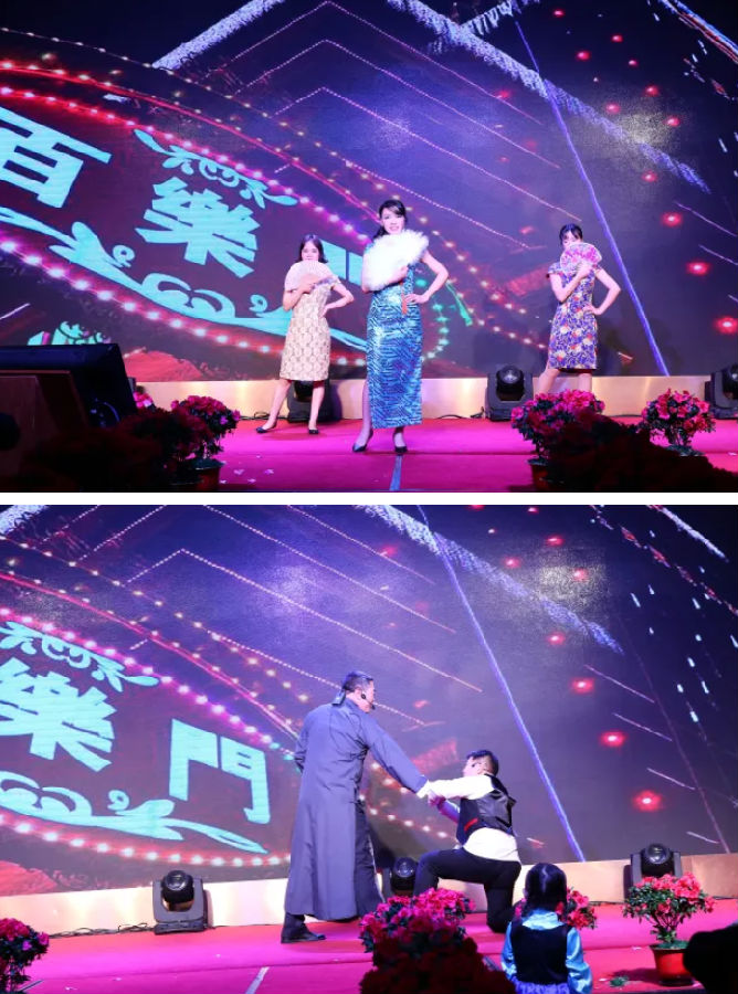 由餐饮部经理史晓东和工程部总监陈勇饰演的两名鬼子进村强抢良家妇女(人力资源部总监谢莲秀饰演),紧接着共产党讨伐日军,迎来了新中国。
